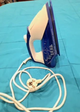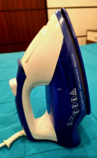 Plancha de vapor Russell Hobbs. - Modelo: Light and Easy Brights. - Color: Azul y blanco. - Indicador de nivel máximo de agua.