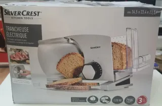 Cortafiambres eléctrico Silver Crest en color plateado. Ideal para cortar todo tipo de alimentos con precisión. - Cuchilla dentada de acero inoxidable. - Selector de grosor de corte. - Interruptor de encendido/apagado.