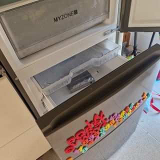 Nevera Haier de acero inoxidable. - Diseño moderno y elegante. - Amplio espacio de almacenamiento.