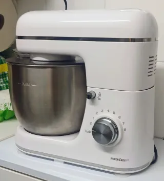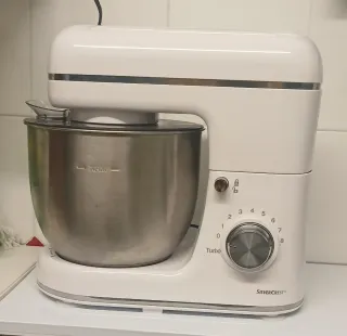 Robot amasador de la marca SilverCrest en color blanco. Cuenta con un bol de acero inoxidable y un selector de velocidad. - Bol de acero inoxidable. - Selector de velocidad de 1 a 8 más función Turbo. - Diseño moderno y compacto.