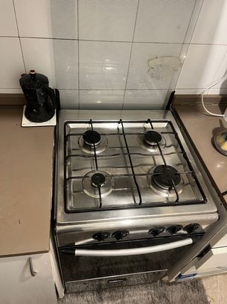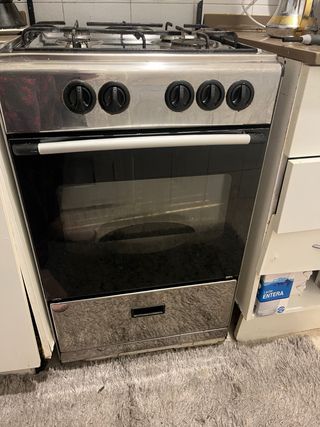 Cocina de gas butano con horno. - Encimera de acero inoxidable. - Cuatro quemadores. - Puerta del horno con cristal. - Cajón inferior. 57x51