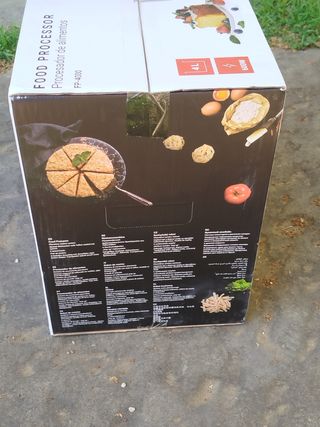 Procesador de alimentos FIMEI multifunción, nuevo en su caja y precintado. - 1300W de potencia. - 3 velocidades y función pulso. - Capacidad de 3.5L para picar y 1.5L para batir. - Incluye molinillo, exprimidor, gancho amasador, batidor y rallador.