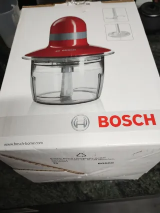 Picadora de alimentos de la marca Bosch en color rojo. - Diseño compacto y moderno. - Tapa transparente para ver el proceso. - Cable de alimentación enrollado.