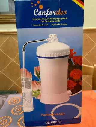 Purificador de agua de la marca Confordes, modelo QS-WF168. - Diseño compacto y funcional. - Incluye grifo dispensador. - Ideal para tener agua purificada en casa.