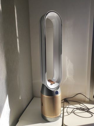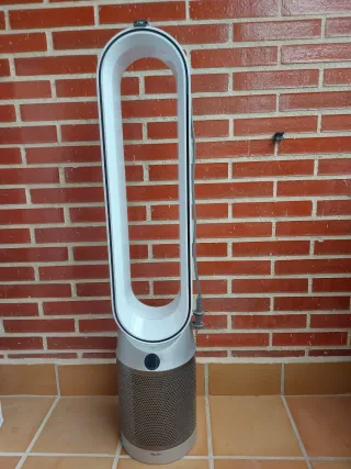 El purificador tiene 5 meses a sido un regalo y no le doy uso...Purificador de aire Dyson Cool con un diseño moderno y elegante. - Color blanco y dorado. - Asa integrada para facilitar el transporte. - Base cilíndrica con rejilla texturizada.