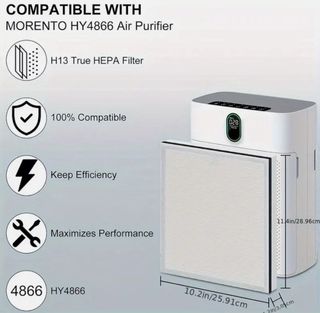 Filtro de repuesto para purificador de aire Morento HY4866. - Tipo: H13 True HEPA. - Compatibilidad: 100% con Morento HY4866. - Dimensiones: 10.2in/25.91cm x 11.4in/28.96cm x 2in/3.0cm.