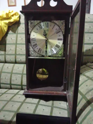 Elegante reloj de pared antiguo, con caja de madera oscura y detalles ornamentales. Y funciona muy bien - Esfera con números romanos. - Puerta de cristal. - Péndulo visible.