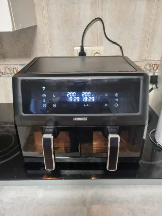 Freidora Princess con doble cesta de 11 litros de capacidad total. Perfecta para preparar dos alimentos a la vez. - Dos cestas independientes. - Diseño moderno en color negro.