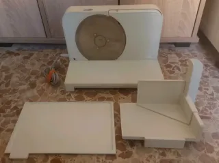 Cortafiambres eléctrico de color blanco y beige. Ideal para cortar todo tipo de alimentos con precisión. - Cuchilla de acero inoxidable. - Bandeja de recogida. - Diseño compacto.