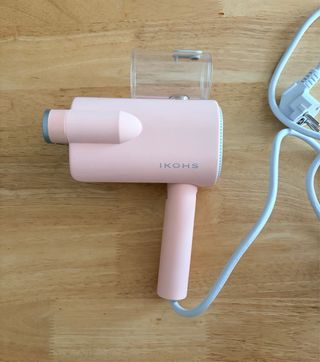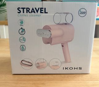 Plancha de vapor vertical IKOHS STAVEL en color rosa. Compacta y perfecta para viajes. - Lista en 25 segundos. - Tecnología anti-goteo. - Fácil de usar. - Incluye cepillo quitapelusas.