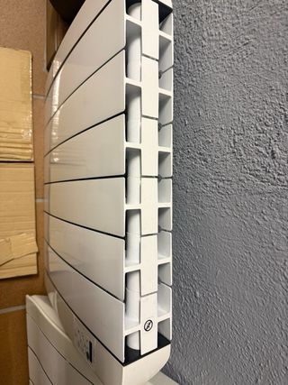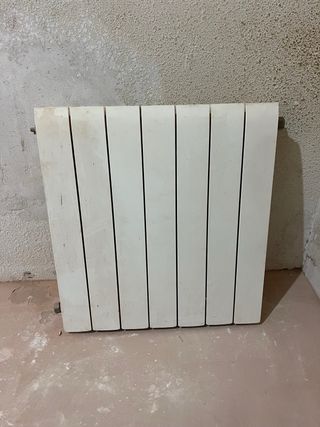 Radiador de aluminio en color blanco. Ideal para calentar tu hogar. Algo sucio por estar puesto durante una obra, pero en buen estado. - Fabricado en aluminio. - Diseño moderno y eficiente.