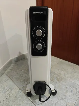 Vendo radiador de aceite marca Orbegozo, modelo RA 1000. Tiene 1000W de potencia y 5 elementos de calor. Ideal para habitaciones pequeñas o despachos. El cuerpo del radiador está en muy buen estado y calienta perfectamente. Tiene termostato regulable y tres niveles de potencia. AVISO IMPORTANTE‼️El cable de alimentación tiene un arreglo con cinta aislante cerca del enchufe (ver foto). Por seguridad, recomiendo cambiar el cable o el enchufe antes de usarlo de forma prolongada.
