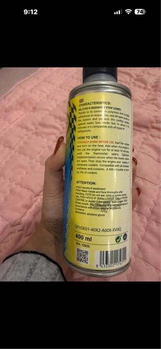 El producto es un sellador antifugas para radiadores de la marca Auto-Gar, referencia AG 2150 G. Diseñado para sellar pequeñas fugas y filtraciones en el radiador, bomba de agua y mangueras. Protege el circuito de refrigeración contra pérdidas de agua y evita el sobrecalentamiento. Compatible con todo tipo de motores (gasolina y diésel) y líquidos refrigerantes estándar. Su fórmula de acción rápida no obstruye los conductos del sistema de refrigeración.