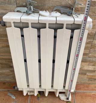 Radiador de agua en color blanco, de cinco elementos. Está en buen estado. - Medidas aproximadas: 24 de ancho 70 de alto y 10 de fondo - Material: Aluminio. - Color: Blanco.