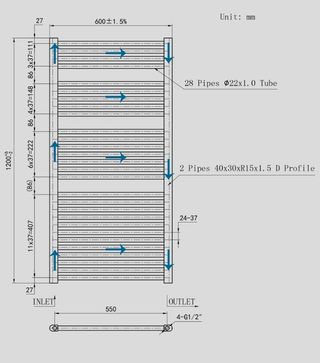 Radiador toallero de metal, color plateado. Nuevo, sin uso. Con su embalaje. Está perfecto, se abrió y vimos que nos habíamos equivocado. Es para circuito de agua. - Medidas: 600x1200 mm (aprox.) - 28 tubos de Ø22x1 mm - 2 perfiles de 40x30xR15x1.5 mm - Incluye soportes de pared.