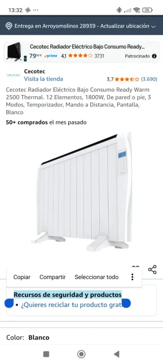 Cecotec Radiador de Aceite ReadyWarm 700 Space White. Radiador eléctrico de 7 módulos, bajo consumo, 800 W, sistema de seguridad, ideal para espacios de hasta 12 m². ✅ SOMOS TIENDA Calle Andreu Soler 7, San Adrián del Besós, Barcelona Lun-Sáb 10:00-14:00 & 16:30-20:00 ♻️ DEVOLUCIÓN AMAZON REVISADA ⚠️ Lo que hay en las fotos es todo el contenido