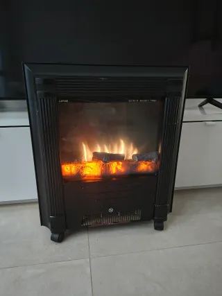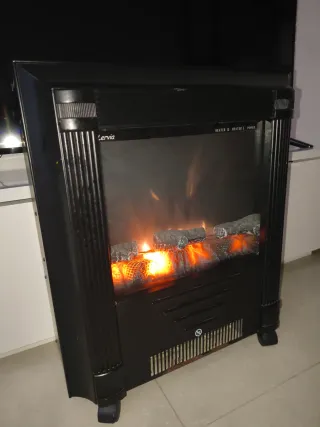 Chimenea eléctrica decorativa con efecto de fuego. - Marco negro con detalles ornamentales. - Panel frontal de cristal. - Base con ruedas para fácil movilidad.