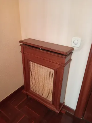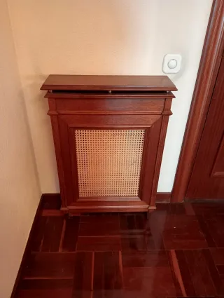 Elegante cubre radiador de madera con detalles en ratán. Tengo otro idéntico, por si interesa.