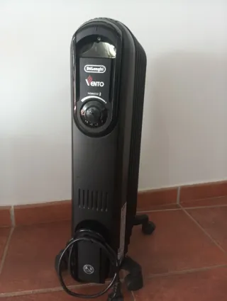 Radiador de aceite DeLonghi en color negro. Cuenta con ruedas para facilitar su movilidad. - Ruedas para transporte. - Cable de alimentación enrollable.