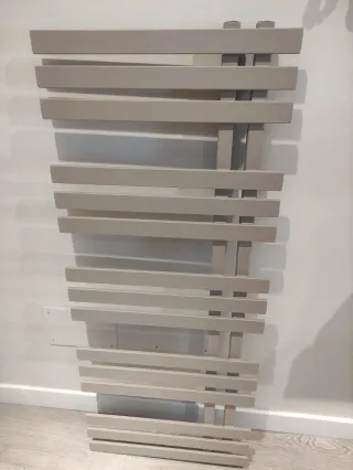 Radiador toallero Verona de Cicsa Medidas: 120x50 cm. Nuevo, sin estrenar. Me equivoqué de medida al comprarlo Fabricado en acero con acabado en capuccino con textura RAL 101. Distancia entre ejes de 6 cm Presión máxima de 8 bar Potencia térmica 568 W. Instalación: vertical No incluye llave + detector Número de lamas: 15 Envío negociable