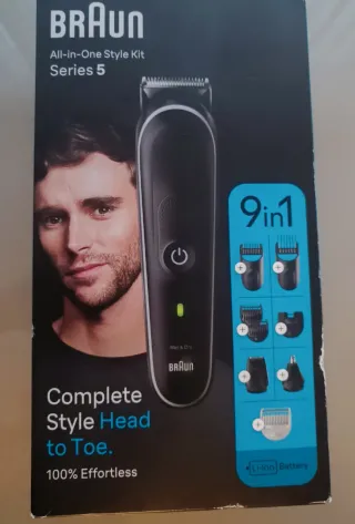 Kit de estilo todo en uno Braun Series 5. - 9 funciones en 1. - Uso en seco y húmedo. - Batería de Iones de Litio. - Completa tu estilo de la cabeza a los pies. - 100% sin esfuerzo.