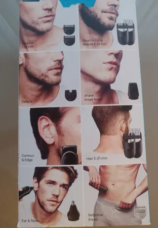 Cortapelos, recortador de barba, perfilado de contornos, recortadora para nariz y orejas. - Incluye 6 accesorios para diferentes estilos. - Tecnología de cuchilla profesional. - 50 minutos de autonomía. - Fuente de alimentación con indicador de carga. - Cuchillas de larga duración. - Fácil de usar y limpiar. - Ajuste automático del voltaje según país.