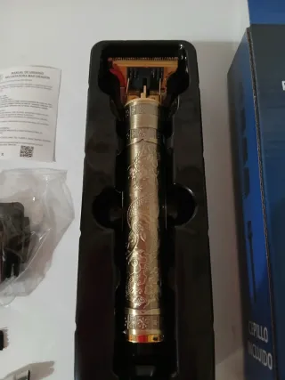 Recortadora de diseño elegante en color dorado, con un grabado de dragón. - Incluye cortapelos, cable de carga USB y cepillo de limpieza. - Viene con un peine guía para ajustar la longitud del corte. - Presentada en su caja original. No envio. Entrego en mano en Humanes de Madrid.