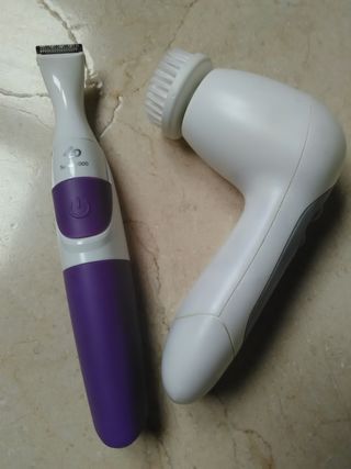 perfiladora/recortadora linea de bikini, funciona con una pila pequeña A/A, no incluida también puede servir para perfilar cejas y patillas. El cepillo facial funciona con 2 pilas A/A, no incluidas. El precio es por los dos