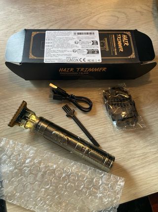 Recortadora de diseño elegante en color dorado, con un grabado de dragón. - Incluye cortapelos, cable de carga USB y cepillo de limpieza. - Viene con un peine guía para ajustar la longitud del corte. - Presentada en su caja original. No envio. Entrego en mano en Humanes de Madrid.