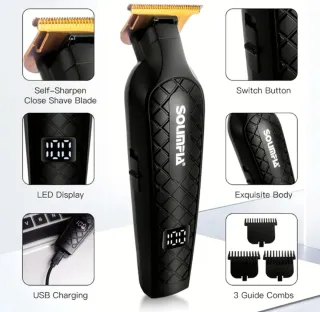 Recortadora de pelo profesional Solimpia HT-6026. Diseño elegante y funcional. - Cuchilla autoafilable para un afeitado apurado. - Pantalla LED para visualización de información. - Carga vía USB. - Cuerpo con diseño texturizado. - Incluye 3 peines guía.