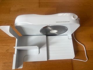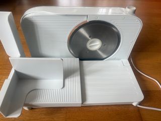 Cortadora eléctrica KRUPS en color blanco, ideal para fiambres, quesos, pan .... Incluye accesorios. Diseño compacto y plegable para almacenar. Fácil, cómoda y rápida limpieza. Ajuste progresivo del grosor (8 puntos). Interruptor de seguridad doble contacto. Cuchilla acero ultratemplado. Válido para colocar platos/bandejas de cualquier tamaño a la salida de corte. Alto 19’5 Ancho 32 Fondo 10 (plegada) No creo que se haya usado ni media docena de veces.