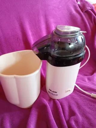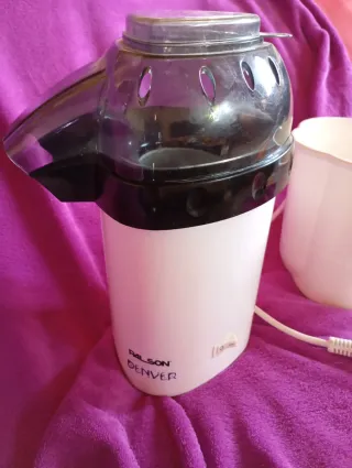 Máquina para hacer palomitas de maíz de la marca Palson, modelo Denver. Incluye un recipiente. - Diseño compacto y moderno. - Color blanco y negro.