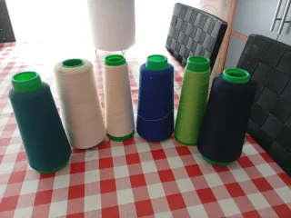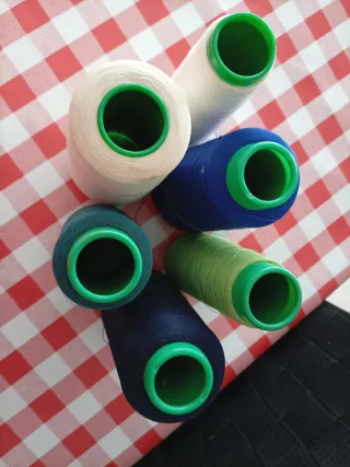 Se vende lote de 6 conos de hilo para remalladora. - Hilo de color azul marino. - Hilo de color verde. - Hilo de color azul. - Hilo de color blanco roto. - Hilo de color blanco. - Hilo de color verde oscuro.