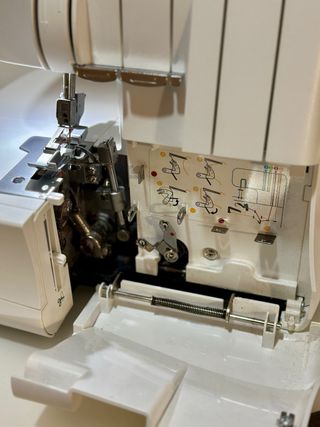 Remalladora Singer modelo 14T957DC. - Color blanco - Incluye accesorios: pedal, soporte para hilos, accesorios, funda protectora. La máquina funciona perfectamente, estéticamente se ha quedado por los años la parte baja un poco amarilla. es lo único que le pasa. pero no es un impedimento para coser, es simplemente estético.