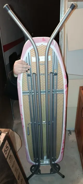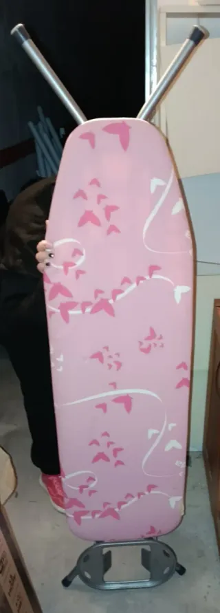 Tabla de planchar con un bonito diseño en color rosa. Marca vileda - Diseño de pájaros y ramas en rosa y blanco. - Patas metálicas plegables. Un pequeño roto de la tela en la esquina pero se puede cambiar la tela Solo para recoger en mano