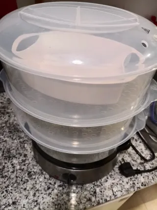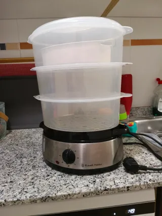 Vaporera eléctrica Russell Hobbs con tres niveles apilables para cocinar diferentes alimentos a la vez. - Tres cestas transparentes. - Base de acero inoxidable. - Temporizador. - Indicador luminoso de funcionamiento.
