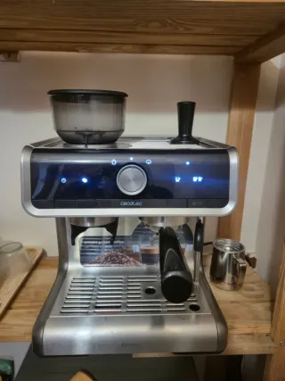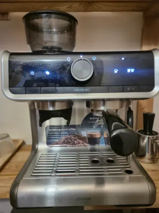 Cafetera de espresso Cecotec Cumbia. - Diseño moderno en acero inoxidable y negro. - Panel de control con botones iluminados. - Depósito de agua extraíble. - Bandeja de goteo. - Incluye accesorio para espumar leche se vende por muy poco uso nueva bale mas de 300 euros se puede venir aver sin compromiso no ofertas absurdas por favor