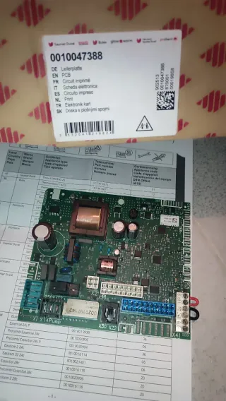 Placa electrónica de repuesto para sistemas Saunier Duval. PRECINTADA, NUNCA ABIERTA. - Número de pieza: 0010047388 - Tipo: PCB / Circuito impreso - Compatible con varios modelos como: Semia Condens 25/30 Thelia Condens 25A Hermann Micraplus Condens F25A y 25A-1