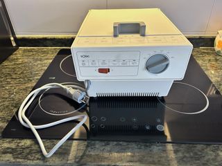Freidora de aire Jata en color negro con capacidad de 1.5 litros. - Diseño compacto. - Panel de control intuitivo. - Asa extraíble para facilitar el uso. - Perfecta para 1/2 personas - Precio original nueva 59€ - Esta en perfecto estado. La cambiamos porque nos han regalado una nueva en las pasadas fiestas - En su caja original