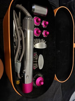 Set completo de Dyson Airwrap en perfecto estado, listo para usar. - Incluye el cepillo principal y varios accesorios. - Viene con su estuche de almacenamiento. - Diseño elegante en tonos plateados y fucsia.