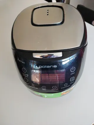 Multicocina Polaris con panel de control digital en ruso Características Principales del Modelo PMC 0517AD Potencia: 860 W. Capacidad: El recipiente tiene un volumen de 5 litros y cuenta con asas para facilitar su manejo. Programas: Incluye un total de 52 programas de cocción. Interfaz: Panel de control táctil con pantalla LCD y temporizador de retardo de hasta 24 horas. Diseño: Cuerpo de plástico y metal en colores plata y negro, con asa de transporte integrada.