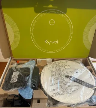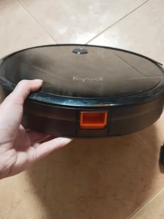 Robot aspirador Kyvol de color negro, ideal para mantener tu hogar limpio. - Incluye base de carga y adaptador de corriente. - Diseño circular y compacto. - Conexión Vía Wifi. - App para el móvil. Puedes programarla, enchufarla, pararla, todo a distancia, sin estar en casa. - No hace mucho ruido.
