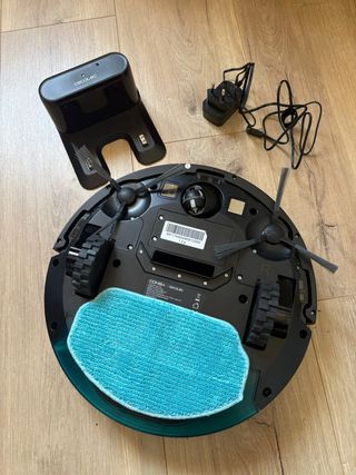 Aspiradora robot Cecotec Conga en color negro. - Base de carga incluida. - Cargador de corriente incluido. - 2 mopas lavables - Mando teledirigido Aspiradora en perfecto estado. Cuando el filtro está lleno se vacía, tiene depósito de agua para que también pueda ir aspirando a la vez que friega. Muy útil si tienes mascotas o poco tiempo para aspirar, desde la aplicación se puede programar para que te aspire, aunque no estés en casa.
