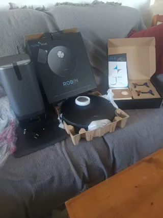 Robot aspirador Conga 1590 de Cecotec, con sistema de navegación inteligente. En su caja original - Base de carga. - fuente de alimentación - Mando a distancia. - Cepillo de limpieza. - Depósito de polvo. - depósito de agua - funciona bien pero uno de los cepillo no funciona no gira