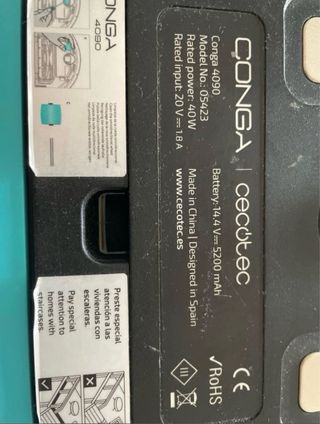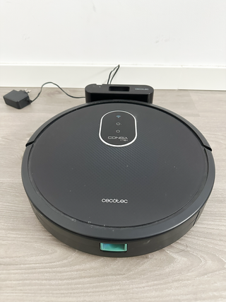Robot aspirador Conga 3890 en color negro. Incluye accesorios. - Robot aspirador. - Base de carga. - Mando a distancia. - Cepillo principal. - Cepillo lateral. - Filtro. - Paño de fregado. Tiene alguna marca en la tapa, pero funciona como nueva. Muy poco uso, a nuestro bebe le da miedo el ruido.