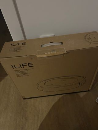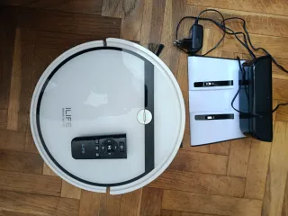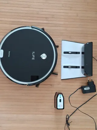 Robot aspirador de la marca ILIFE, en buen estado y listo para usar. Ideal para mantener tu hogar limpio. - Incluye mando a distancia. - Incluye base de carga y adaptador. - Cepillos laterales incluidos.