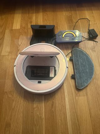 Robot aspirador Conga iLife en color rosa. Incluye su base de carga y accesorios. Funciona perfecto Aspira y friega el suelo - Base de carga. - Accesorio de fregado. - Cargador.