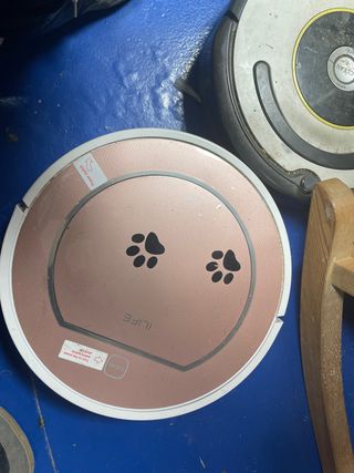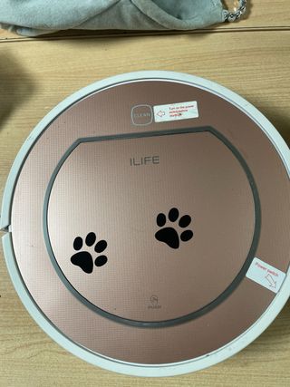 Robot aspirador ILIFE en color rosa con un divertido diseño de huellas de patitas. - Diseño redondo. - Acabado metálico. - Botón de CLEAN visible. Le faltaría las baterías que estan estropeadas