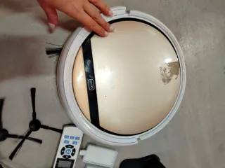 Sigue funcionando estupendo. Solo se le queda la tapa abierta,yo le pongo un plástico pega. El deposito de agua sin usar, ni las mopas. Con muchos recambios. Robot aspirador Ilife en color dorado y blanco. Incluye mando a distancia, cepillos laterales y filtro. - Diseño redondo. - Botón 'CLEAN' visible.