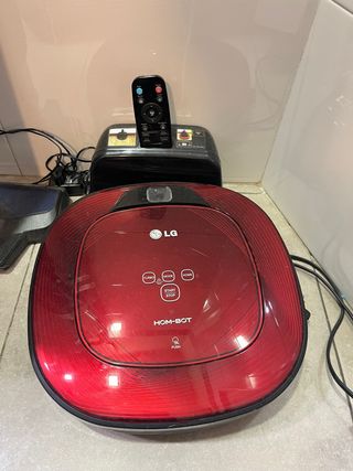 Robot aspirador LG en color rojo. Incluye su base de carga y mando a distancia. - Base de carga. - Mando a distancia. - Manual de instrucciones. Tiene algunos arañazos que no afectan a la funcionalidad. Funciona como el primer día.
